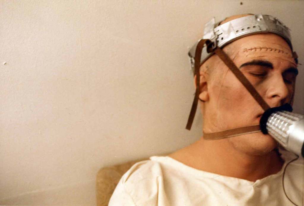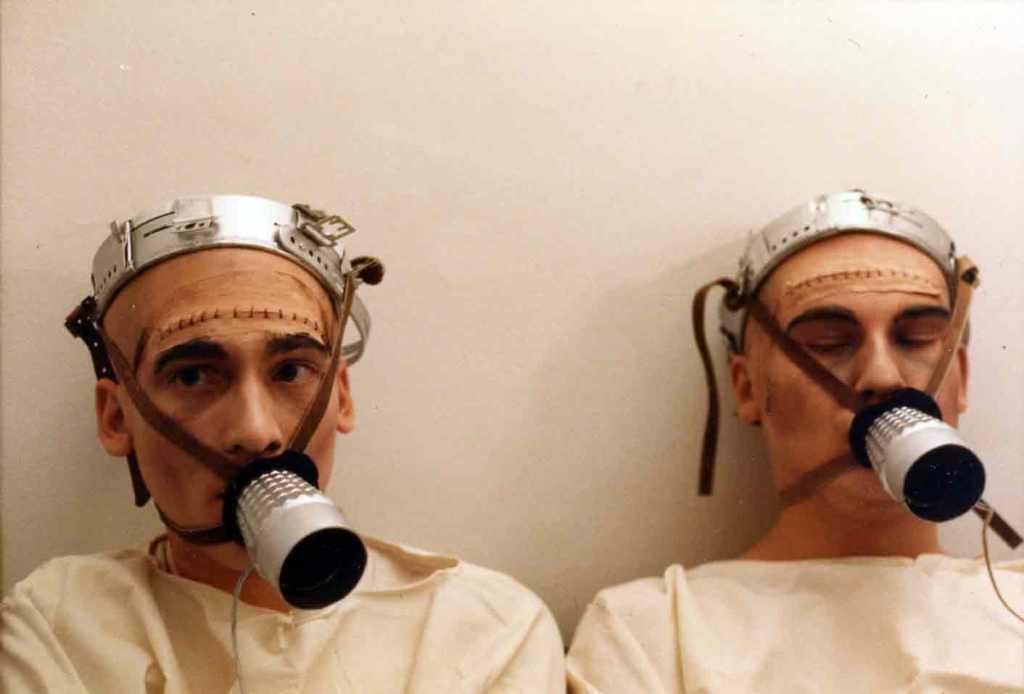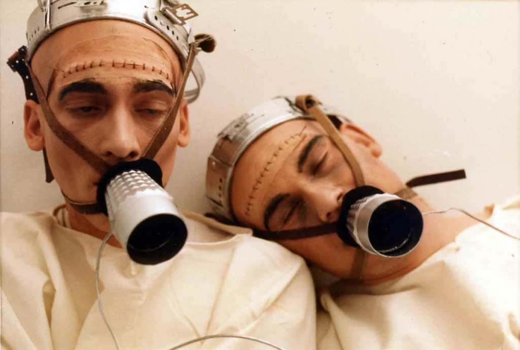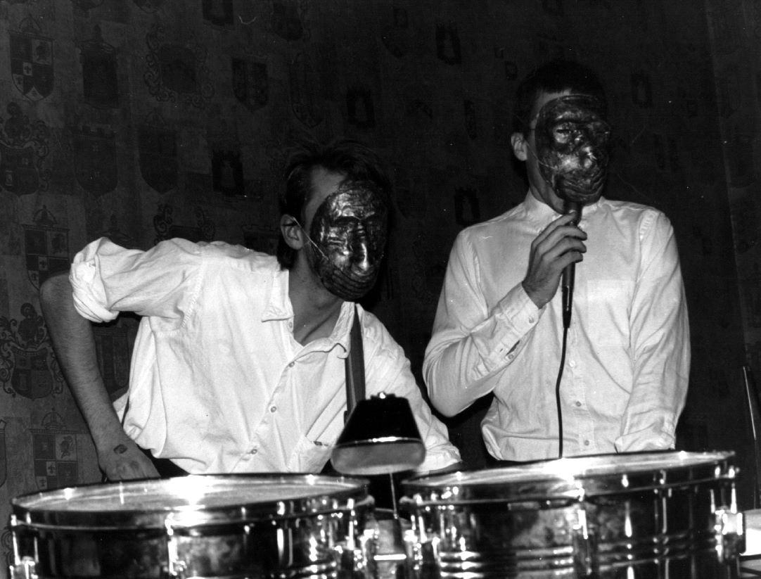 The performers included all four members of SCW plus an additional four performers recruited for the show. SCW played in the background while the other four were up front using various mic-ed up domestic and industrial tools: Charles on vacuum cleaner/balloon, Jim on sewing machine, Claudio on power tools and John on heavy metal. Film projections and video were also part of the staging. All the performers wore masks cast from their faces with plaster bandages, similar to the ‘death masks’ dating back to the middle ages. The workers rose up against their slave masters but the power tools of the workers were no match for the media tools of their slave masters…