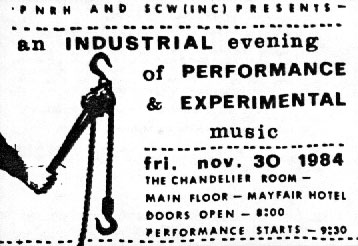 The first proper SCW performance occurred on November 30, 1984 at the Chandelier Room of the Mayfair Hotel in Kitchener, Canada. The show came about through a Fine Arts course that PnrH was taking at the University of Waterloo. The show was actually marked by his professor and applied towards his credit for the course!