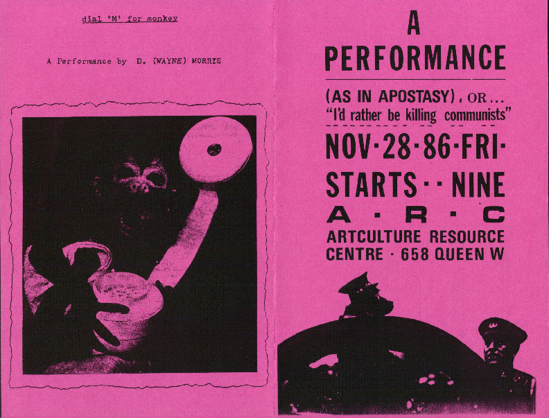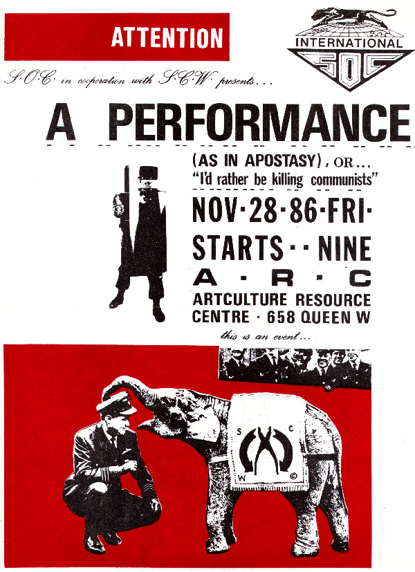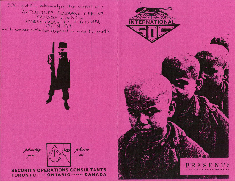In November 1986 PhrH and dWM put on a live performance, once again operating under the name Security Operations Consultants. The performance took place at Artculture Resource Centre, a Toronto arts performance space located on Queen St. West. The full title of the show was: