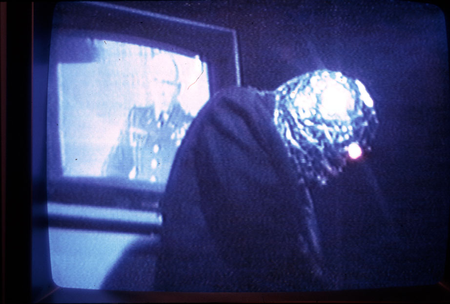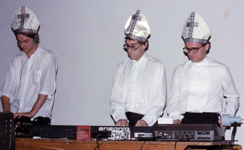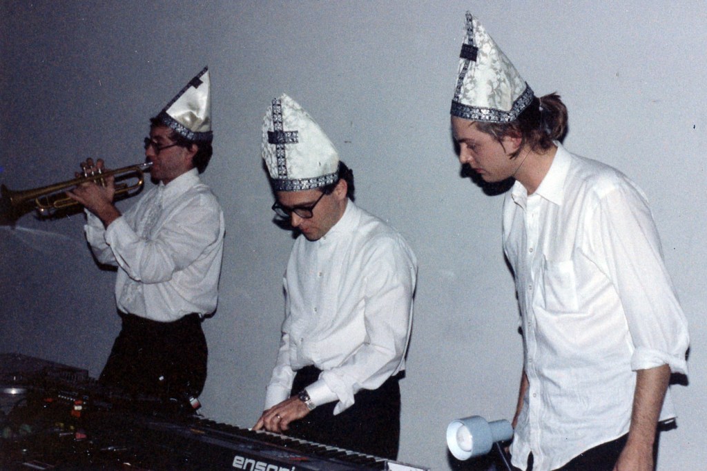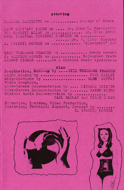For the show the pre-recorded videos were processed and animated live with Amiga computers operated by SCW collaborators Bruce Becker and Catherine Willson, accompanied with sequenced and improvised musical performances by SCW. Because the main focus of the show was the live processed video, the three band members were set up at the back of the darkened hall wearing their Who Shot the Pope? hats, which were created – as always – by SCW’s wardrobe designer Cathie Whittaker.