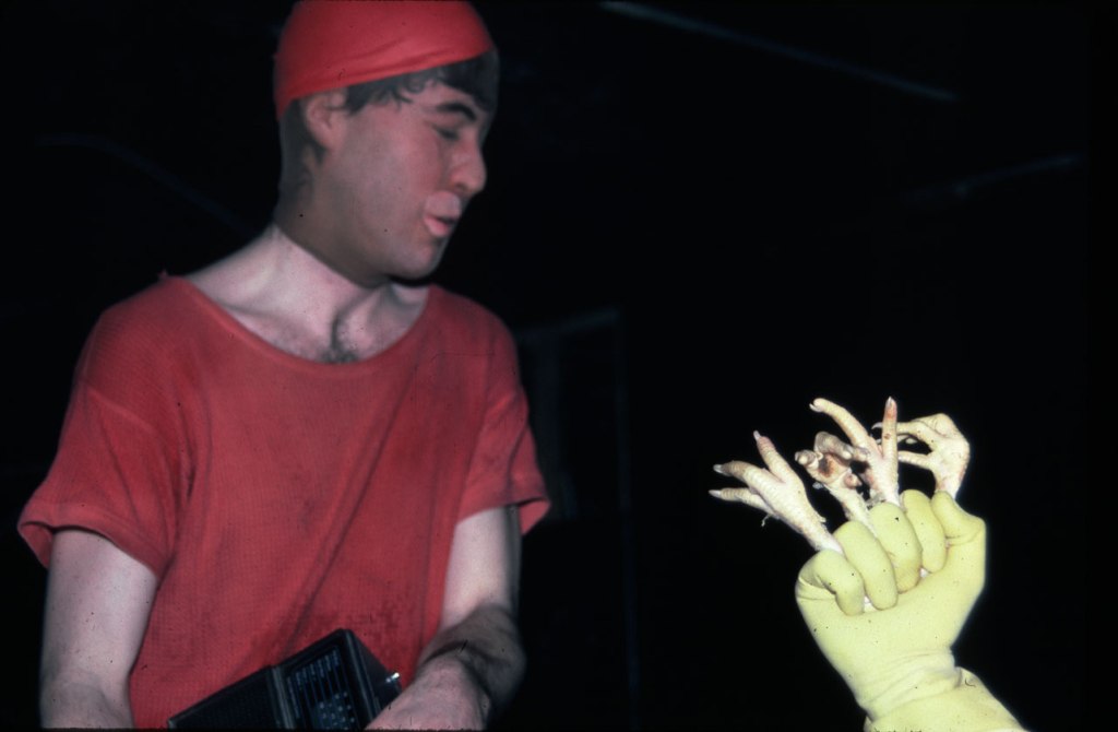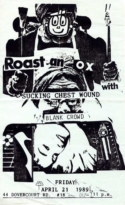 In January of 1987 the full line-up of SCW finally played another live show – the first since moving to Toronto. The show was at a sleazy nightclub called Ildiko’s above a Hungarian restaurant at Bloor St. and Brunswick Ave. in Toronto. SCW played there at the invitation of some friends (thanks Eli!) whose band was also playing. The audience was less than 10 people and they all hated SCW (plus the place was freezing). Unbeknownst to SCW, their friends and collaborators DJ FunKY and William T. Francis had purchased several pounds of raw chicken feet before the show, and proceeded to throw them at the band during our performance. The club owner was not happy about this.
