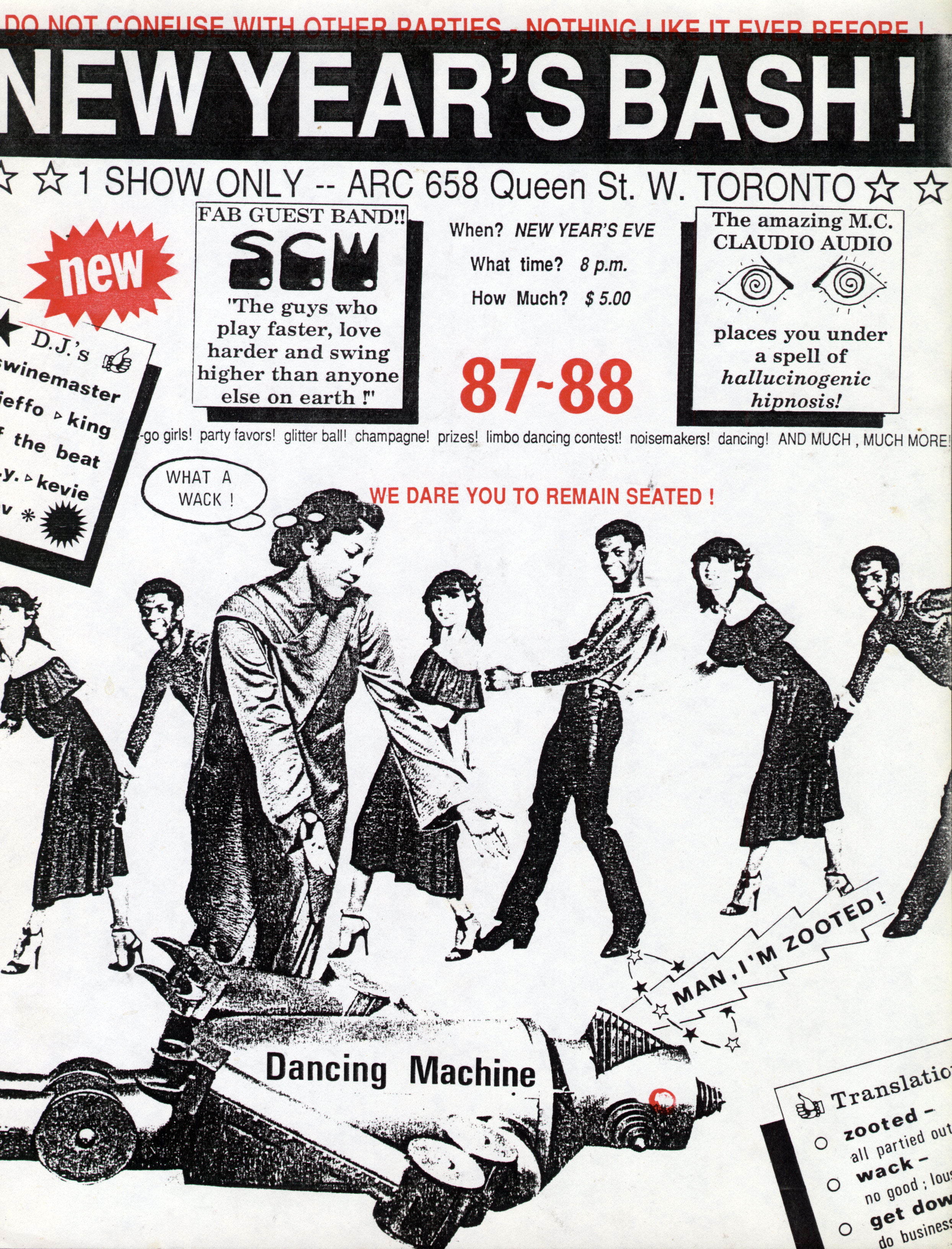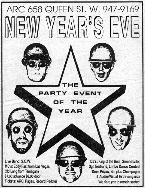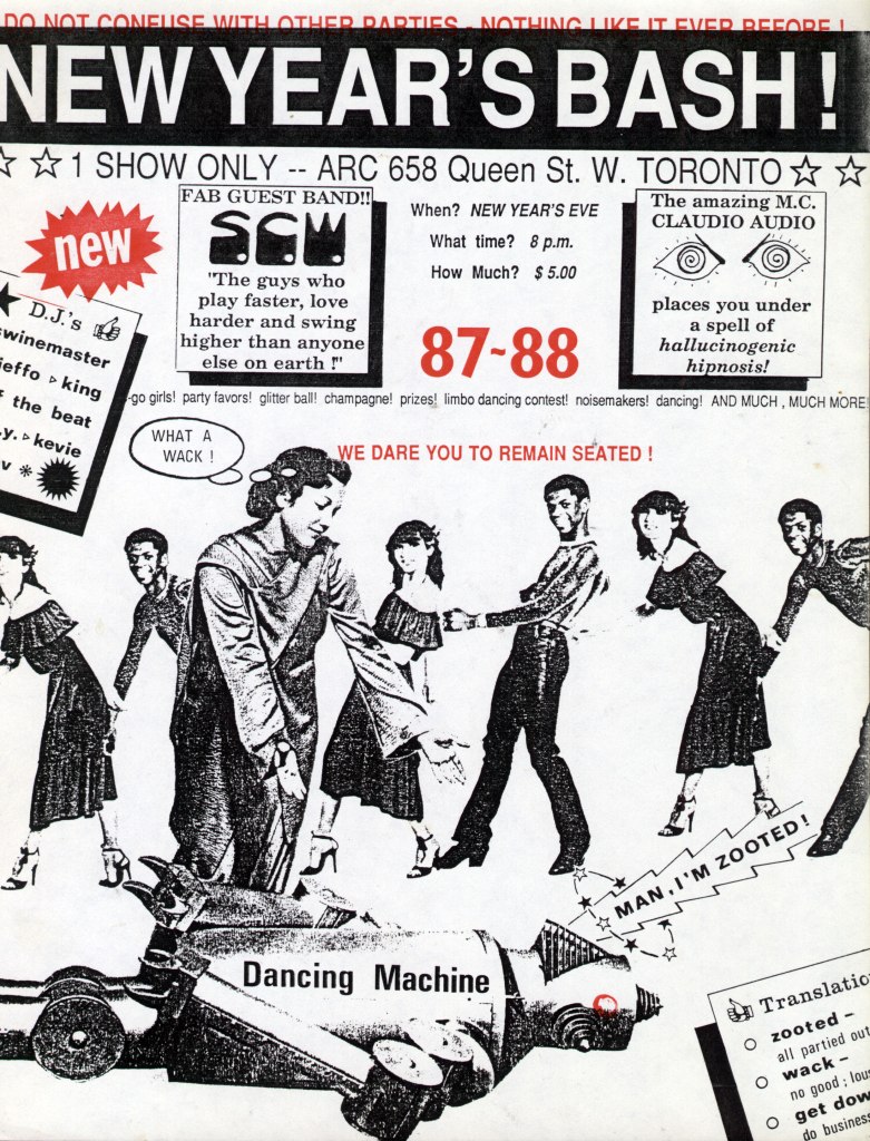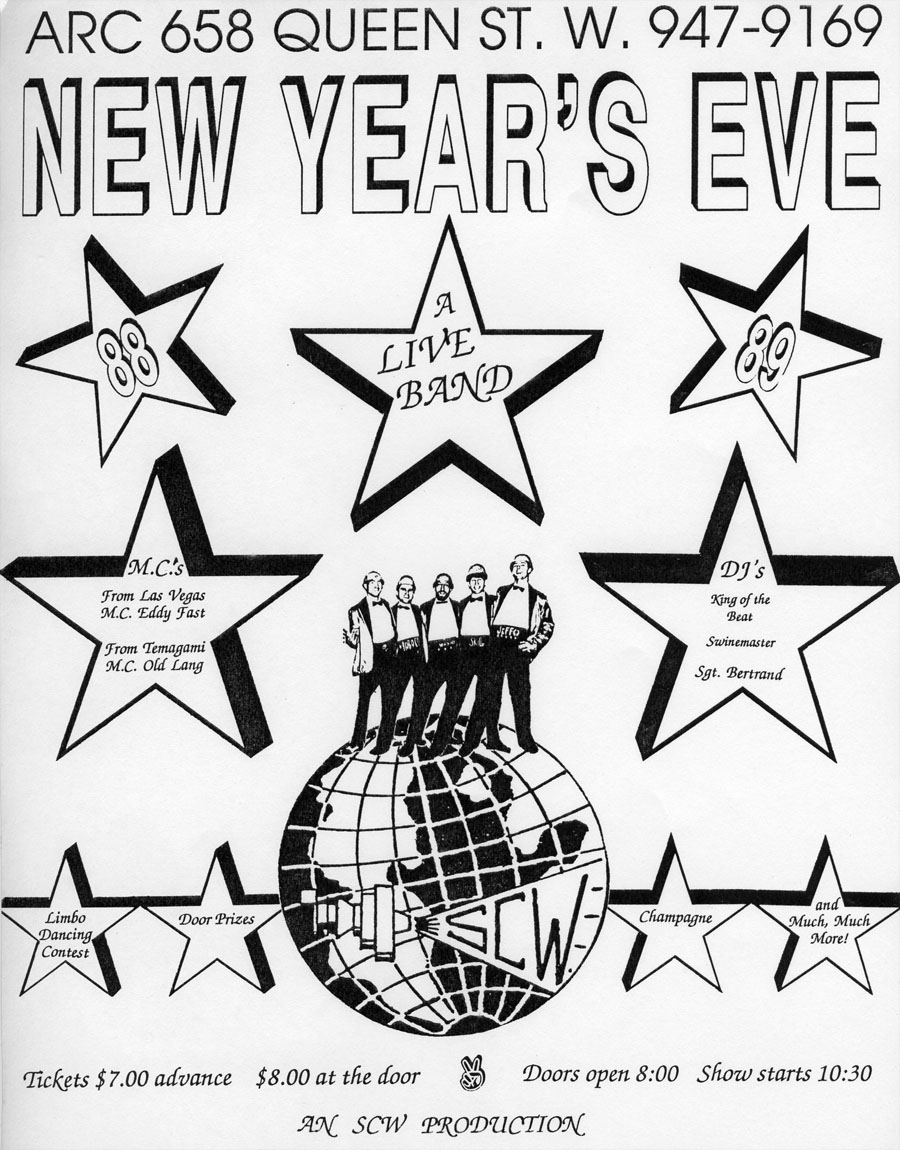 On Dec 31 1987 SCW presented their first annual New Year’s show at a gallery space on Queen St. West in Toronto. With DJs, MCs, limbo dancing and more! Why? Because!